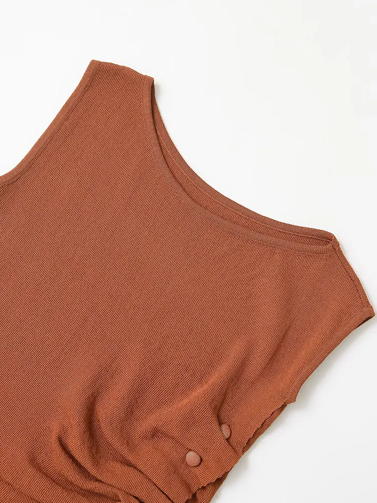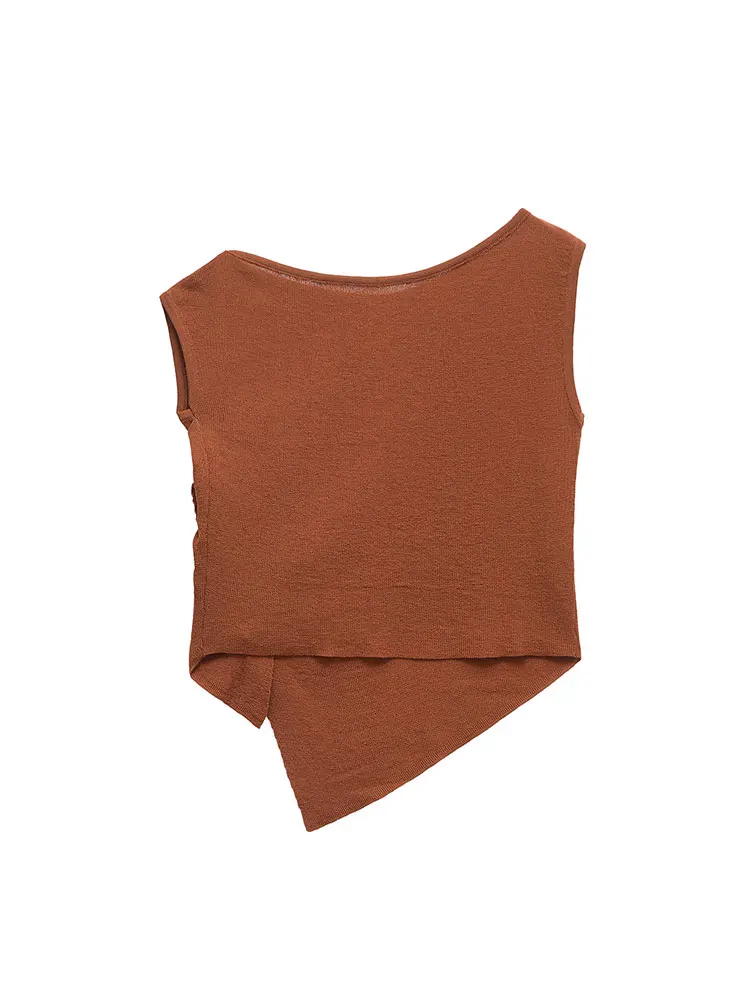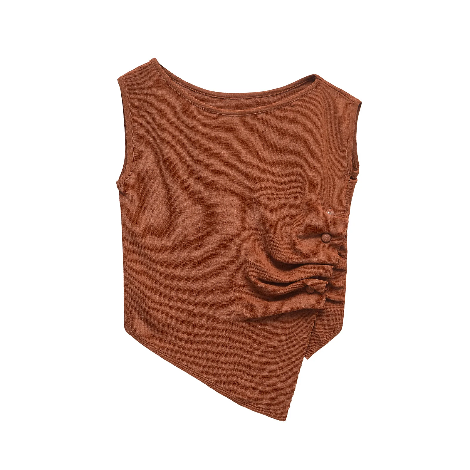 Елегантний жилет з асиметричним кроєм та стильними плиссе. Виконаний з легкої трикотажної тканини з невеликою пружністю для комфортного носіння. Безрукавний дизайн з круглим вирізом ідеально підходить для теплих днів. Модель прикрашена декоративними складками, що додають образу витонченості.