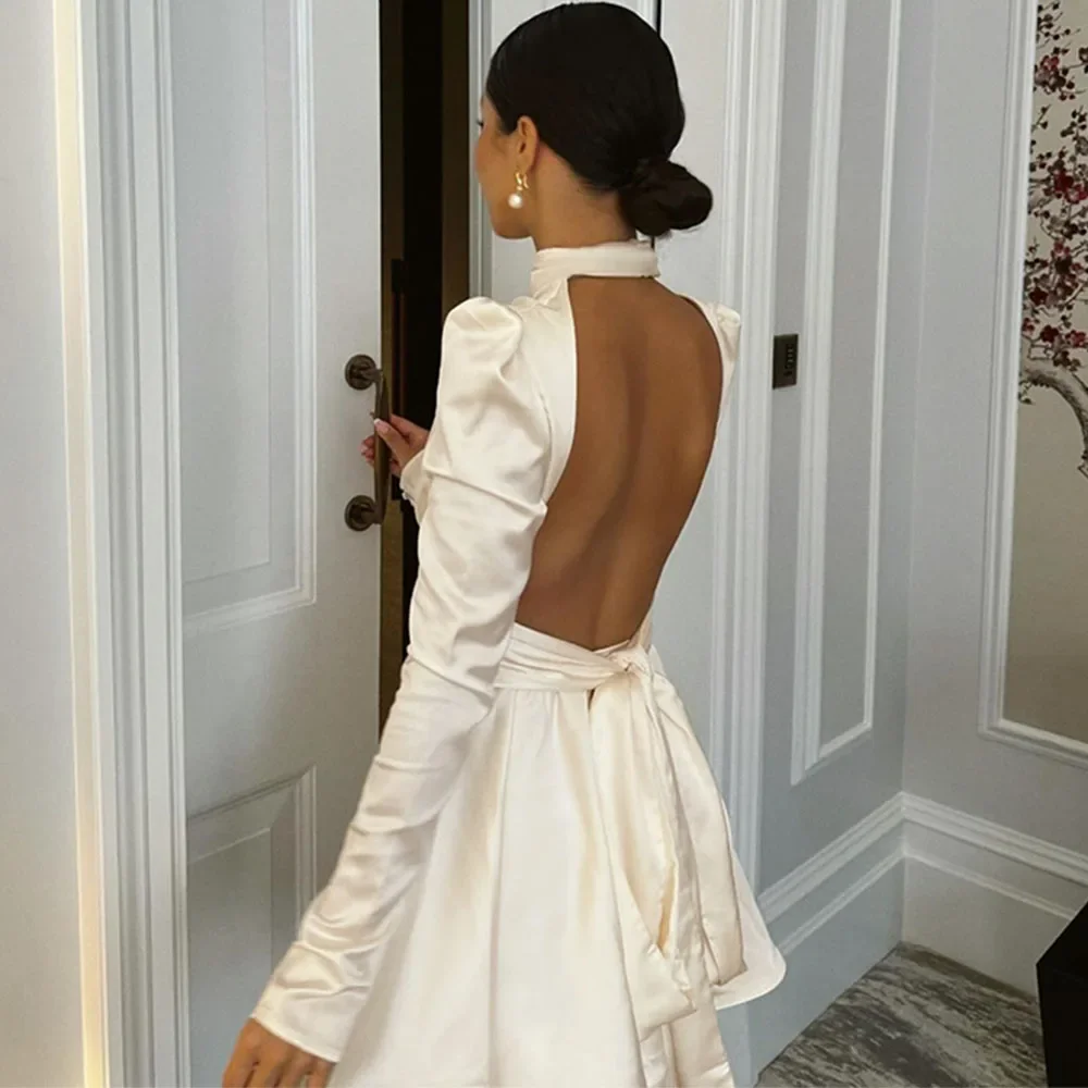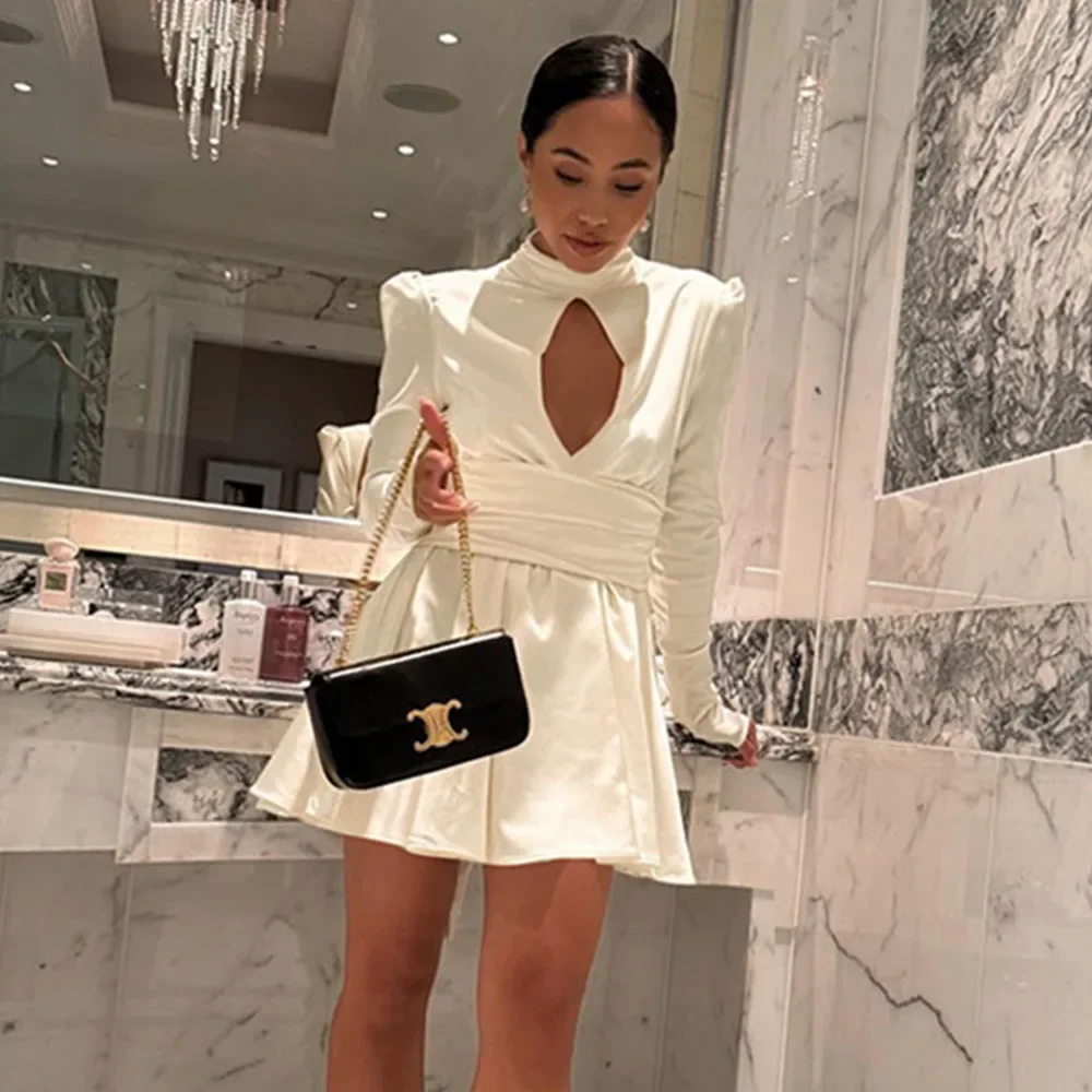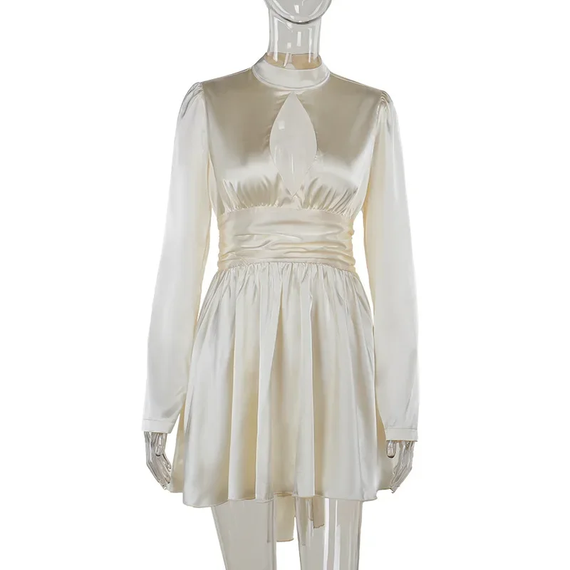 Розкішна сатинова міні-сукня із довгими рукавами, коміром-стійкою та стильними вирізами. Її витончений дизайн, відкриті деталі на спині та довжина вище коліна створюють елегантний образ для вечірок чи урочистих заходів.