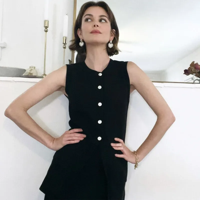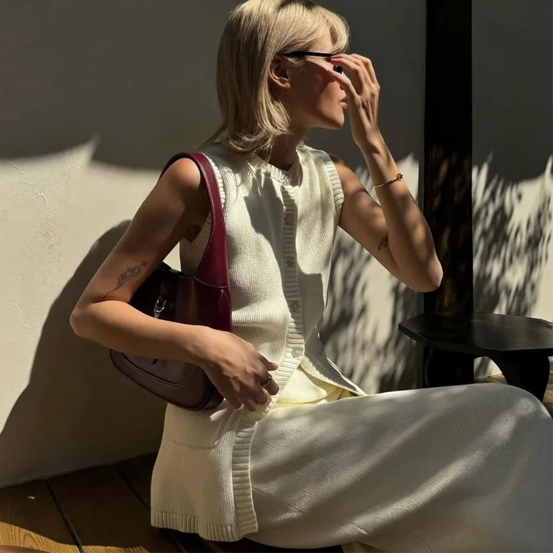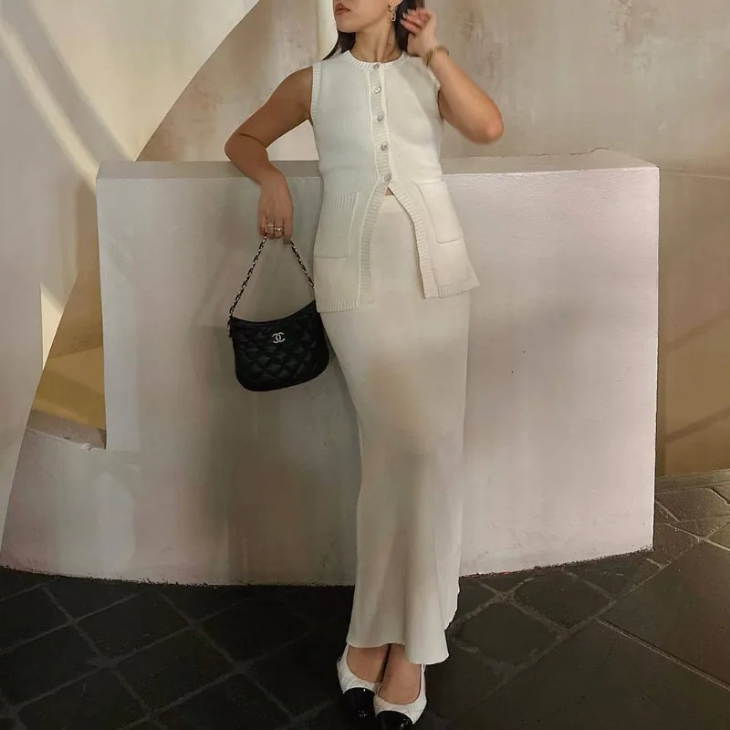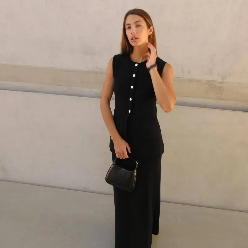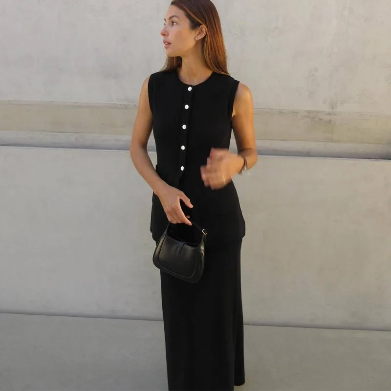 Двохкомпонентний комплект із трикотажу включає топ без рукавів із округлим вирізом і максі-спідницю з високою талією. Елегантний дизайн, застібка на ґудзики та комфортний крій роблять його ідеальним вибором для весняно-літнього гардеробу.